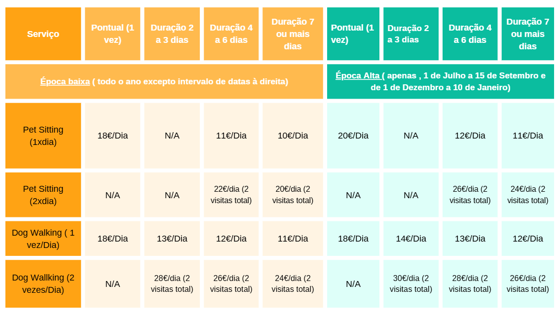 Notas Dog Walking: Serviços de dog walking terão análise caso a caso, exemplo família com 2 cães de grande porte , ou cães com alguma necessidade e/ou temperamento especial, não são passeados ao mesmo tempo. A hora de permanência poderá ser dividida pelos dois animais, ou será feito um serviço de 2h consecutiva, 1h por animal. Análise a ser feita aquando da marcação (vigoram preços diferentes dos acima);